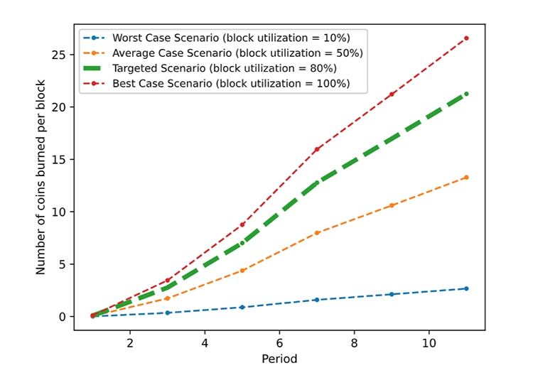 Based on the assumptions above, the number of coins that can be burned within a block period are presented below in Figure 7.