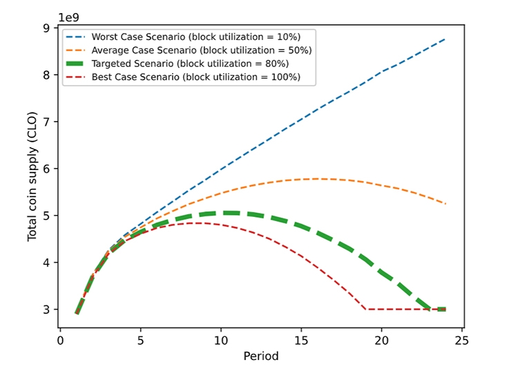 Inflation and deflation periods can make a network unstable. We believe that using a type of mechanism to control the network parameters to maintain the total coin supply at a minimum threshold (3,000,000,000 CLO) will provide the network with optimal stability.