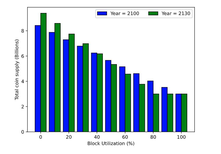 Finally, the projected total coin supply, assuming different static utilization scenarios, from 2021 until years 2100 and 2130, is presented in Figure 9.