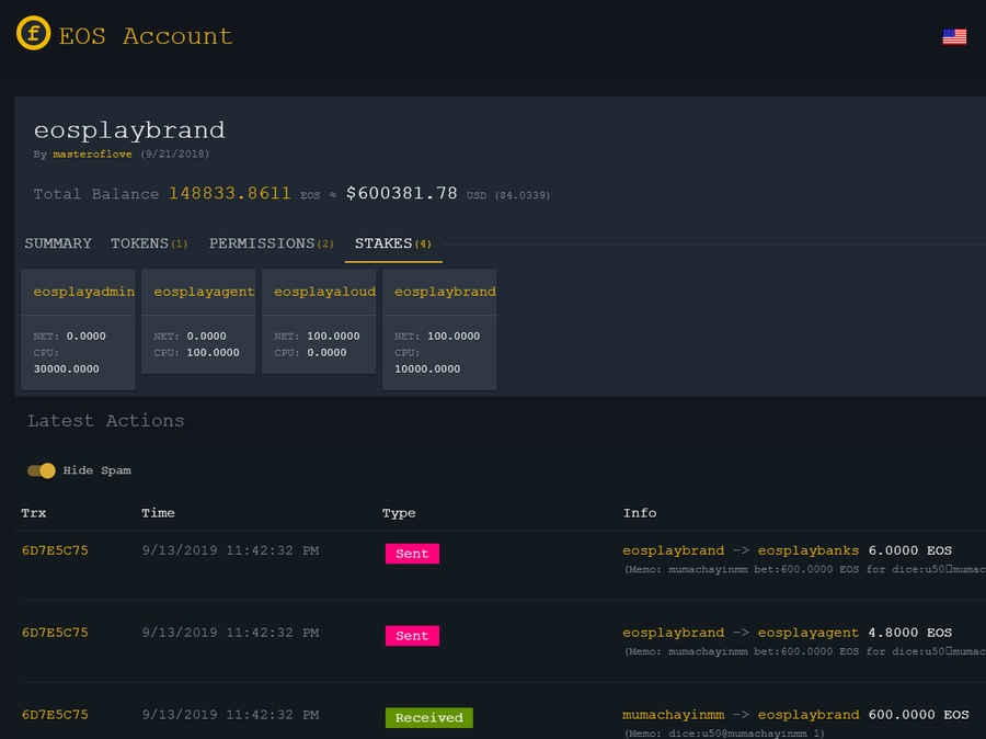 Staked CPU&NET for himself, eosplayadmin and dswinnermach. (I’m not sure but it seems that eosplayadmin belongs to the attacker while dswinnermach is listed as Spinach DApp at the DappRadar)
