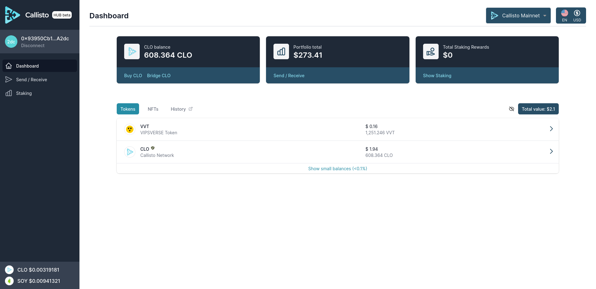 Callisto Hub allows users to easily view their assets, including cryptocurrencies and NFTs, and track their balances in real-time, when they are also able to trade NFTs with peer to peer mechanism. Additionally, the platform enables users to send any token to another address, and includes an address book feature for added convenience. Moreover, Callisto Hub provides users with the ability to manage Callisto Cold Staking, a unique feature of the Callisto Network that allows users to earn rewards by staking their Callisto (CLO) coins.